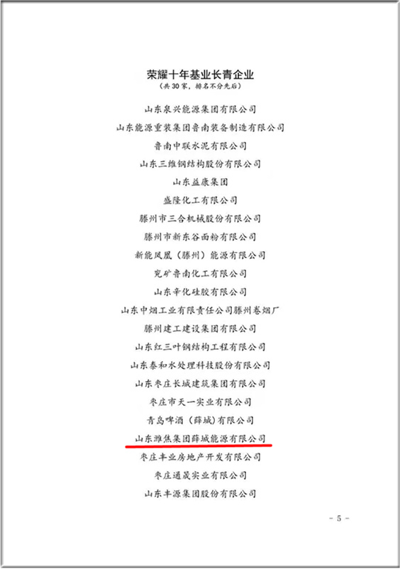 薛城能源公司榮獲“榮耀十年基業長青企業”稱號